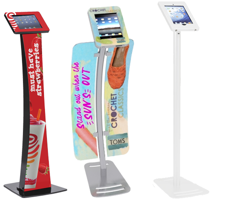 Our engineered aluminum Apple iPad and Microsoft Surface Stands are designed for tradeshows, events, and retail environments. They are lightweight, secure, and easy-to-assemble and transport. Most feature the innovative Swivel Stop, allowing the iPad or Surface to rotate seamlessly between the portrait and landscape position. Graphic options include wings, halos, and face plates.