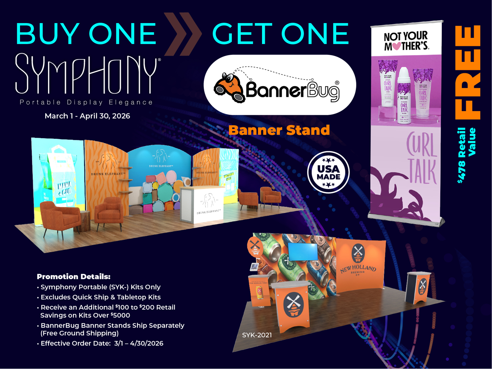 Personalize your Symphony Display with attractive counters, workstations, floating graphics, iPad clamshells, and monitor mounts. The lightweight aluminum frames are engineered for SEG dye-sublimated fabric graphics for a seamless, wrinkle-free look. Add floating graphics for additional visual layering and branding.