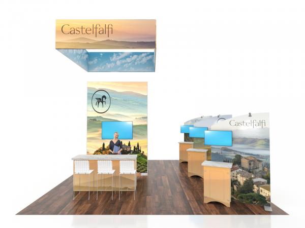 The designs include two seating areas: a bar with locking storage and casual seating with rental furniture. For more visibility, add a hanging sign to ensure your brand is conspicuous throughout the show hall.