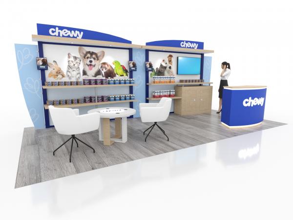 Getting noticed at a trade show starts with a beautiful exhibit. The VK-1135 and VK-4053 displays are attractive custom modular designs with practical features. Those include shelves, monitor mounts, large format graphics, and locking storage. Both the 10 and 20 ft. versions have LED accent lights with programmable RGB lights on the custom reception counter.