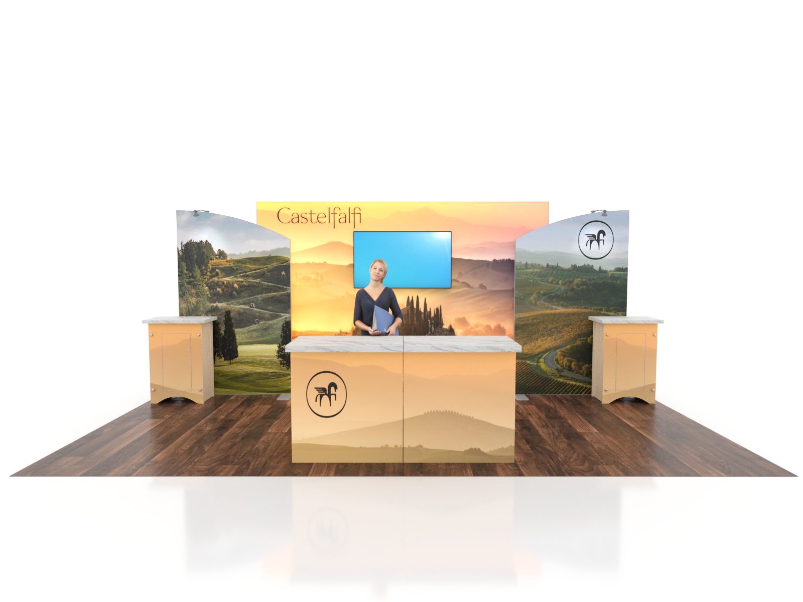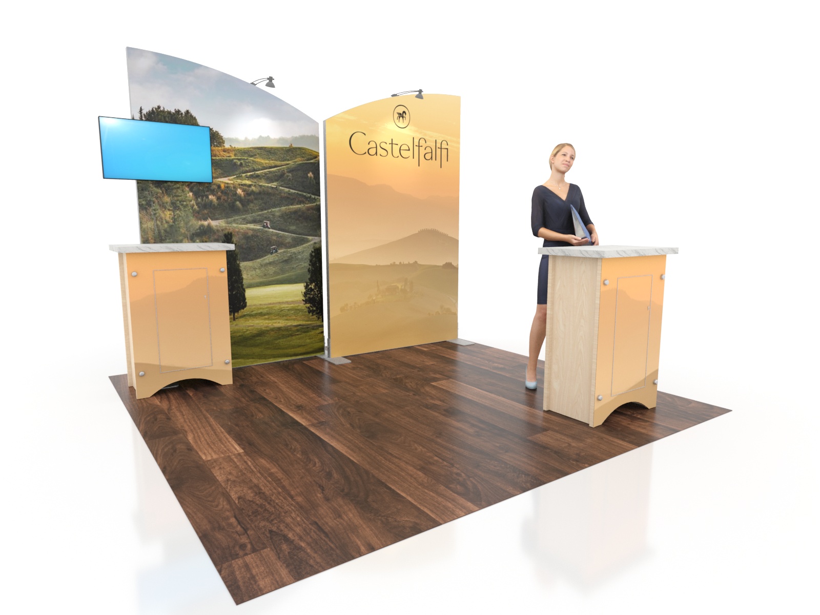 Personalize your Symphony Display with attractive counters, workstations, floating graphics, iPad clamshells, and monitor mounts. The lightweight aluminum frames are engineered for SEG dye-sublimated fabric graphics for a seamless, wrinkle-free look. Add floating graphics for additional visual layering and branding.