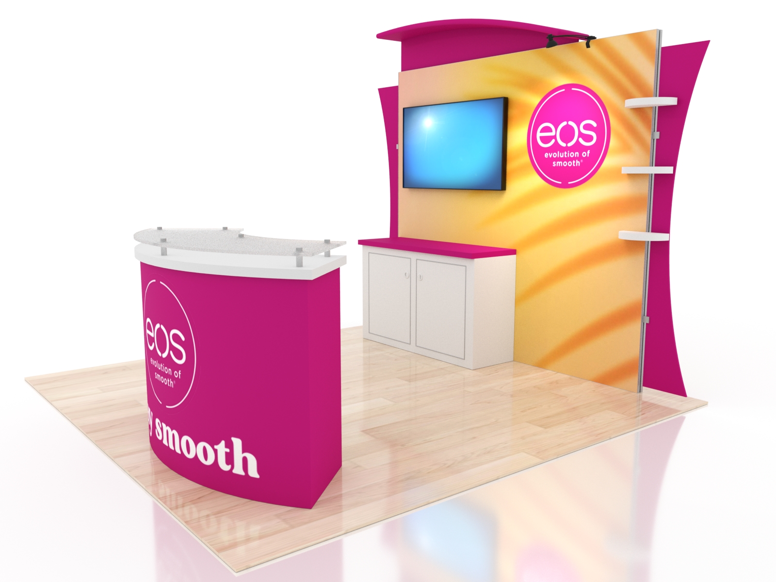 These designs come with ample storage in cabinets on the backwall and in the curved reception counter. Add vinyl graphics to both for more branding. The entire display packs in a fabric-lined, fully jigged custom crate. Each component is numbered for effortless assembly.