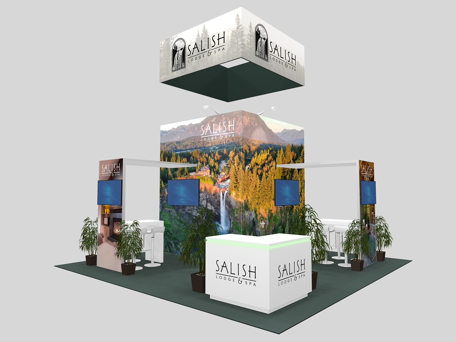 Canopies are cooler than ever before! More and more trade show island designs are incorporating canopies to add depth and dimensionality. The RE-9211, 9212, and 9214 series shows how canopies can stretch the booth space while also creating semi-private meeting areas for demos and meetings.