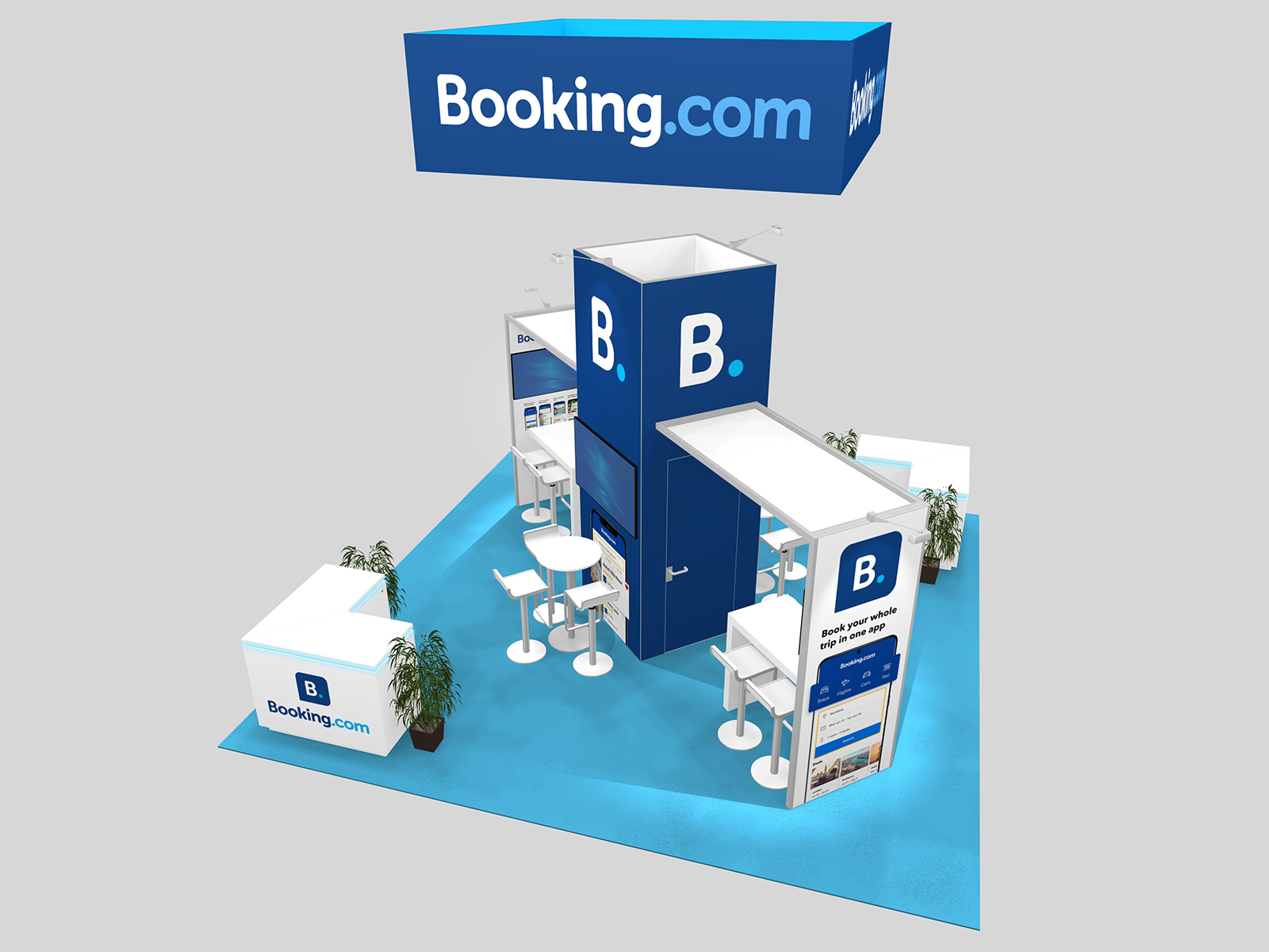 The RE-9214 is a peninsula island with access on three sides. It features two meeting spaces, a large rectangle reception counter with locking storage, and a casual lounge with charging ports. All three designs include a square hanging sign for maximum visibility in the show hall.