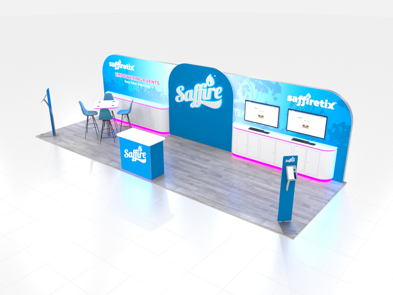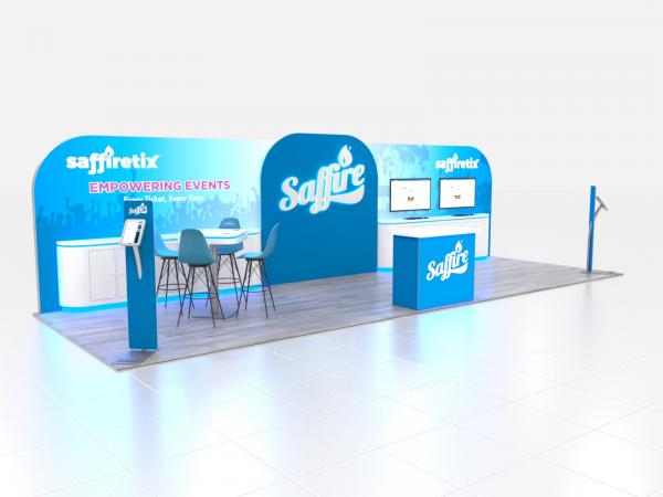 And while the LED lights and backlit graphics provide pizzazz, the reconfigurable inlines are also functional with extensive counters, locking storage, and monitor mounts. There’s even a wireless charging table for meetings and iPad stands for registration, lead retrieval, or product information. Both designs allow for ample space for attendees and booth staff to interact and conduct business.