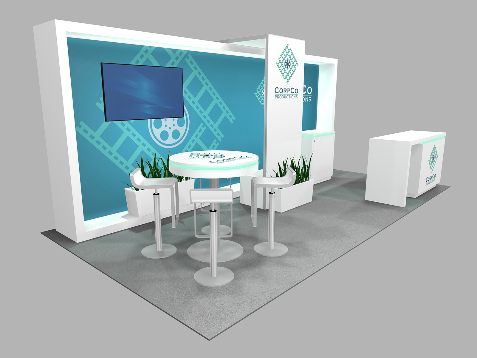 The exceptionally strong, yet lightweight frame, supports up to a 50 in. LED monitor. 10 ft. and 20 ft. lightbox versions are available with a wide assortment of attractive counters, charging solutions, and kiosks. Transform your trade show marketing with a RE-2164 rental exhibit.