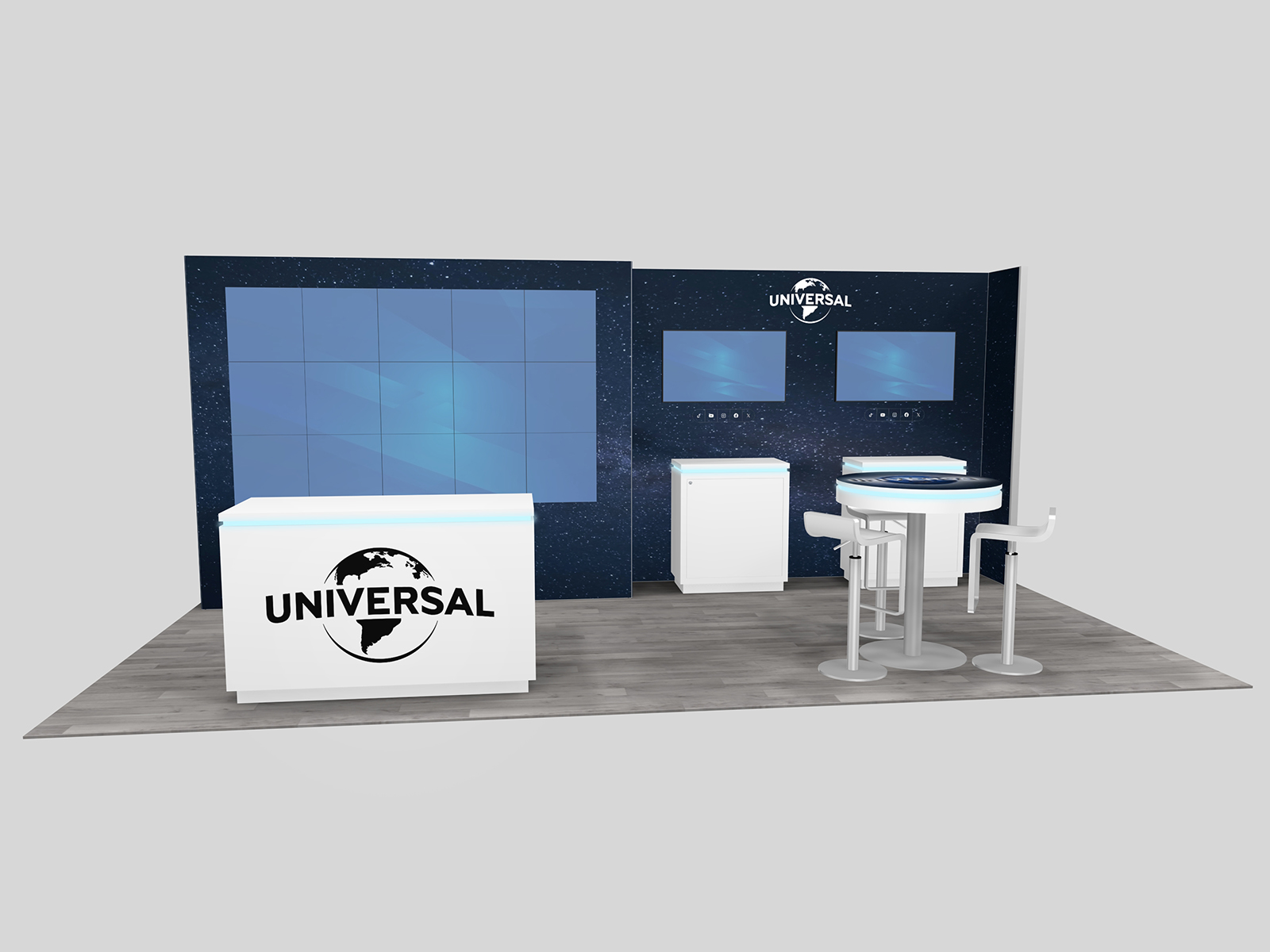 The 10 x 20 exhibits include seating, wireless charging, extensive storage, and monitor mounts. The base price excludes the video tiles since most exhibitors rent them from onsite A/V providers, which not only saves on shipping but ensures technicians are available at the trade show to handle the installation. Supercharge your trade show marketing with a modern rental exhibit that includes all the “bells and whistles.”