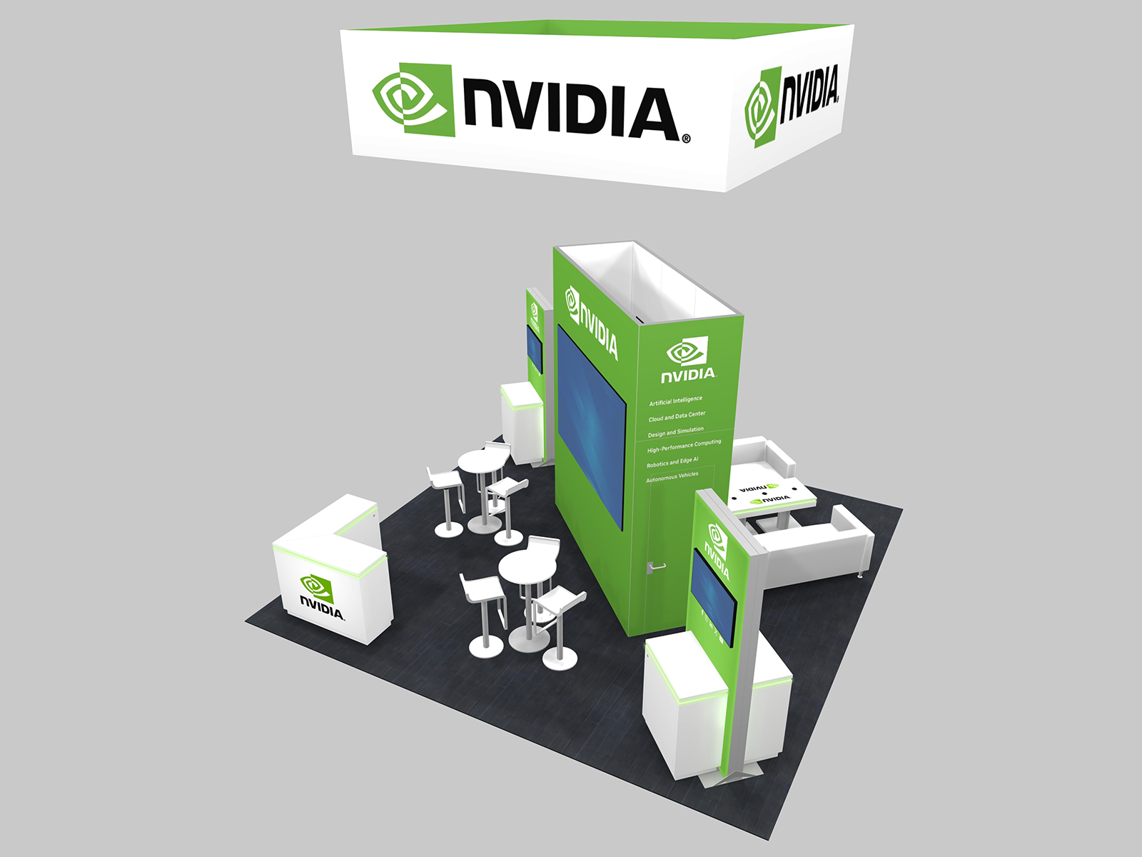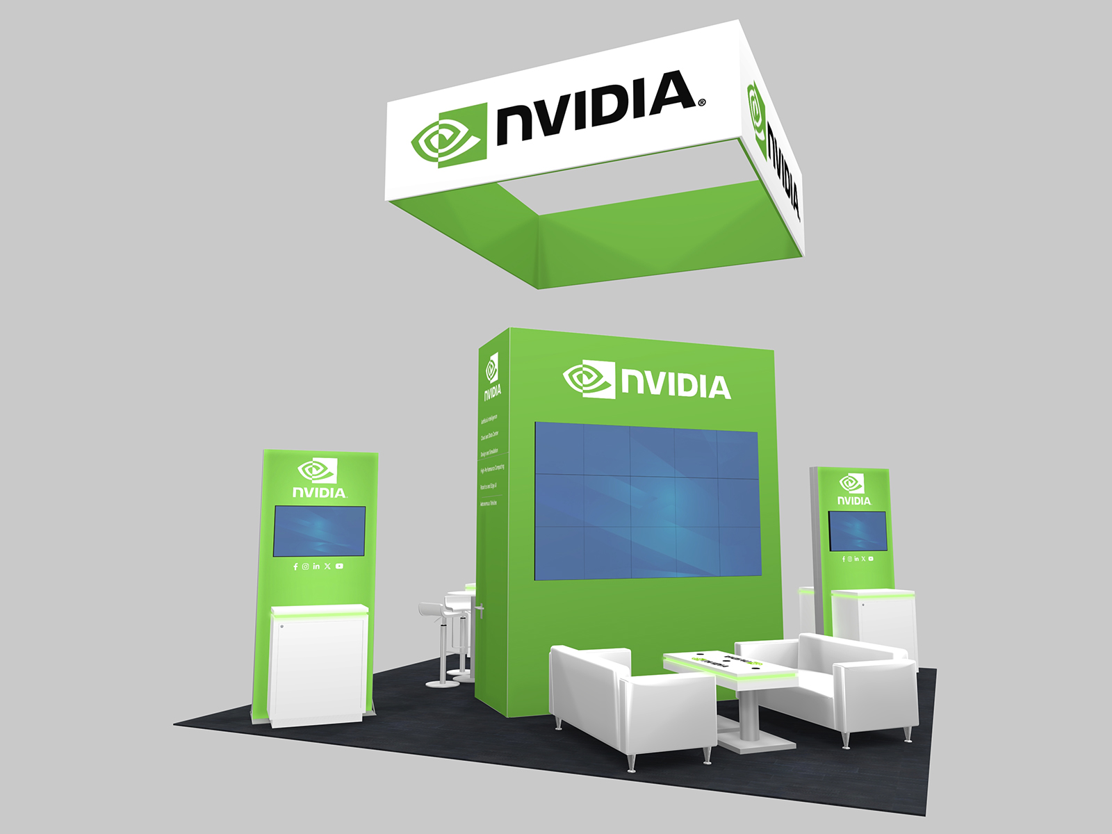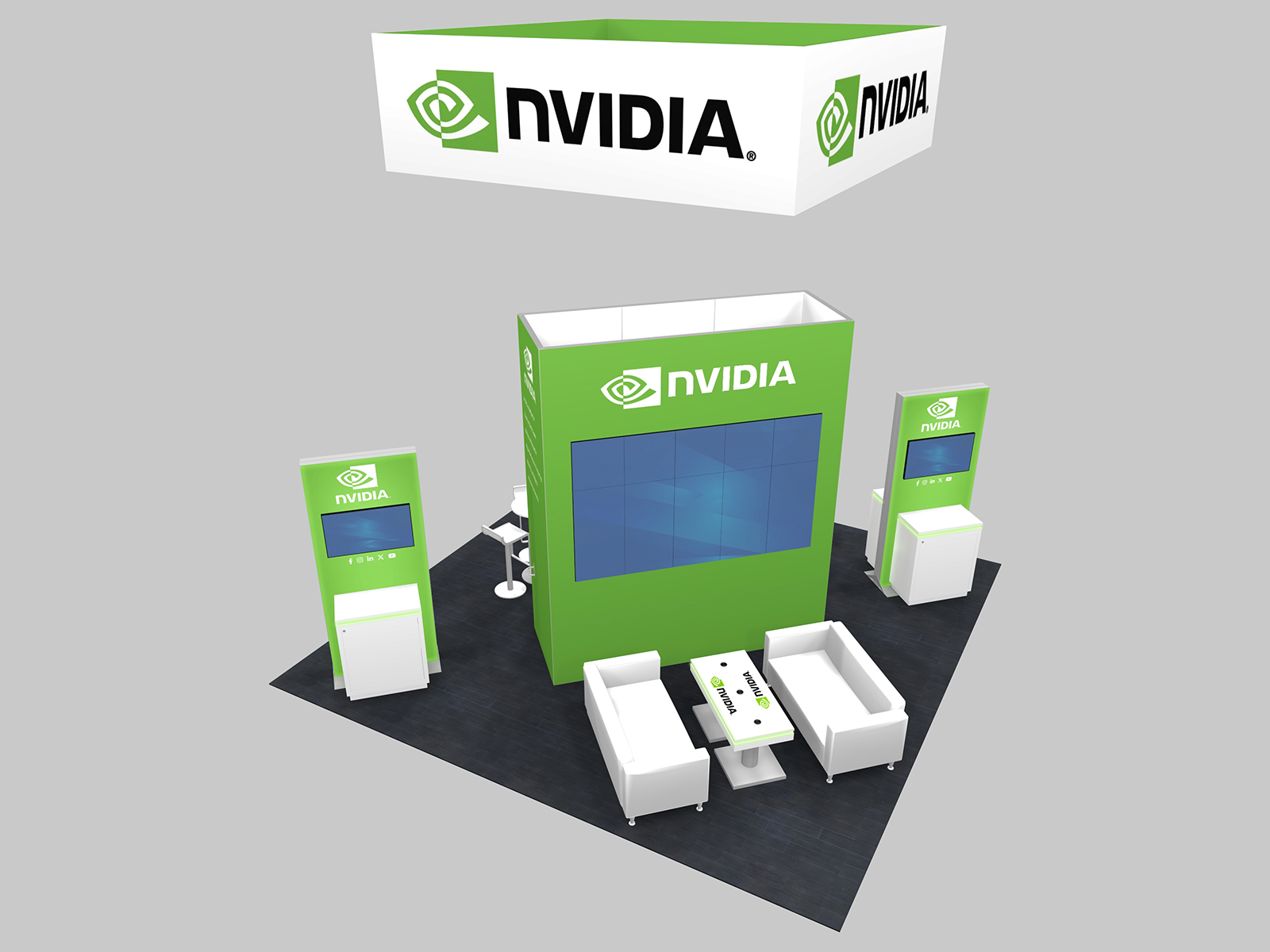 The 20 x 20 exhibit offers exhibitors a compelling blend of casual seating, demo stations, and a designated reception counter. The central tower supports a video tile option along with locking closet storage. In addition, there are two demo stations with monitor mounts, SuperNova lightboxes, and a coffee table with LED accent lights and wireless charging.