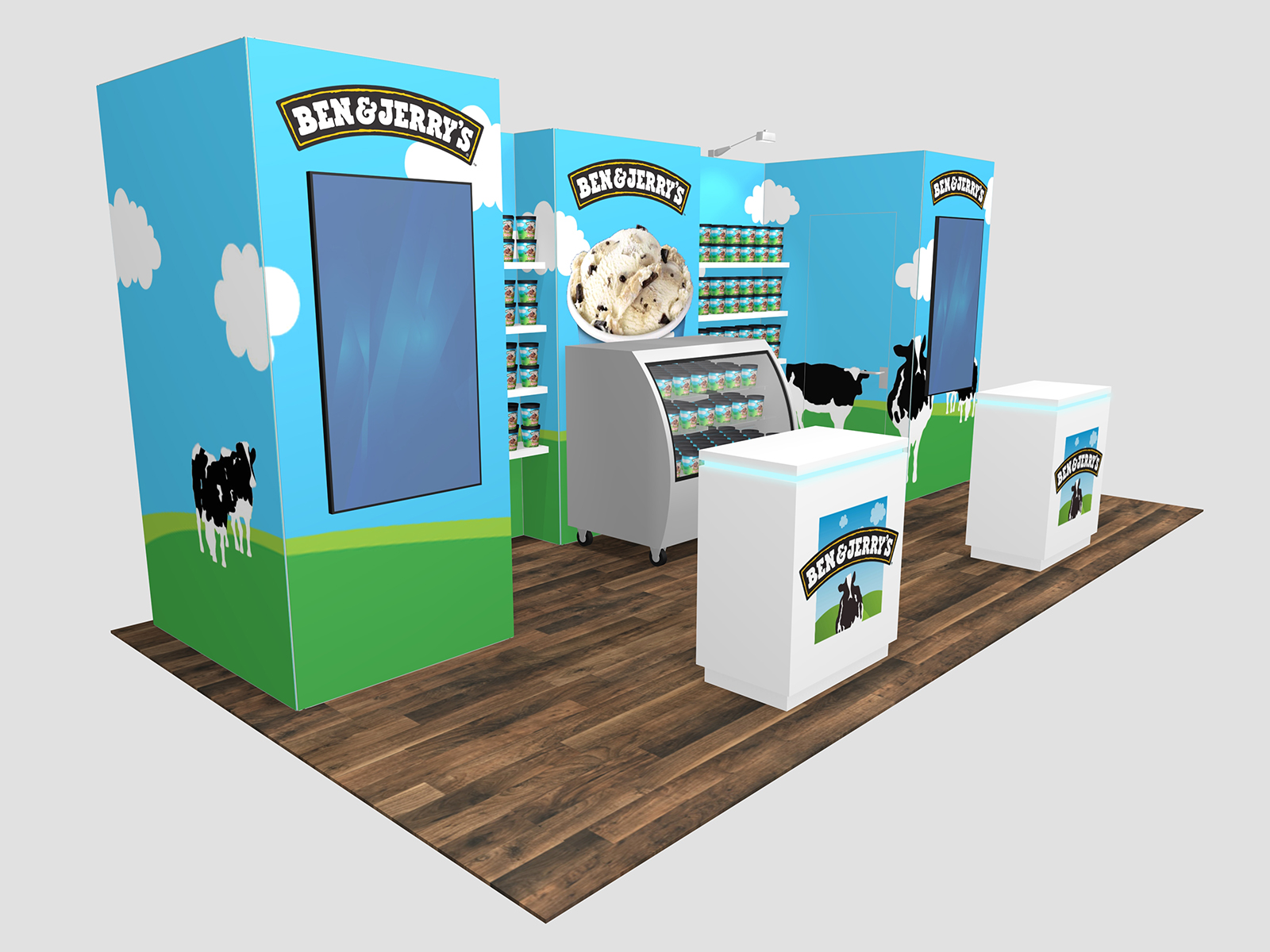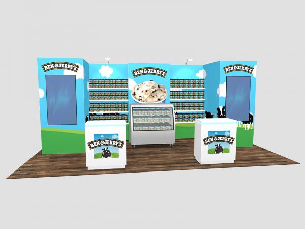 These beautiful and practical 10 x 20 exhibits blend product displays, sampling options, bold graphics, and multi-media video into a cohesive visual presentation. They include extensive shelves, large format fabric and direct print graphics, LED accent lights, and even space for refrigerators (RE-2175 and RE-2177). The Gravitee Modular System ensures every setup is quick and easy, the custom counters are fully assembled, and the SuperNova Lightboxes (RE-2176) assemble without tools.