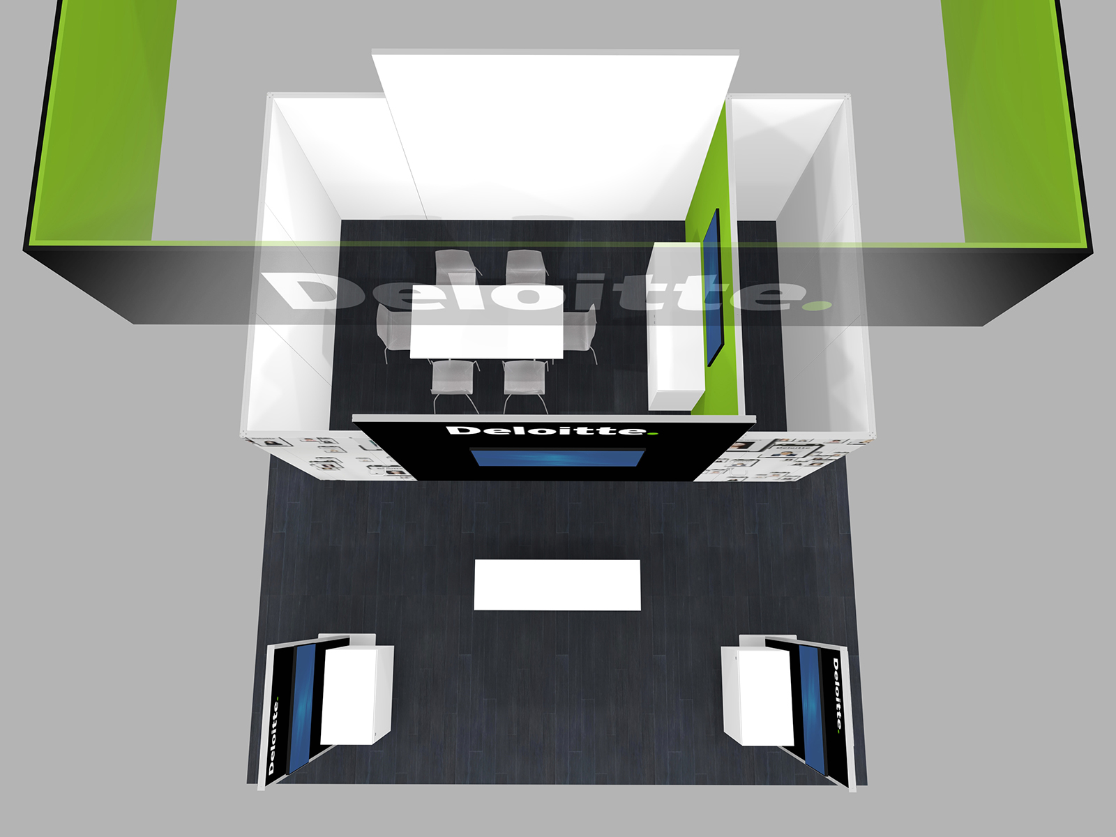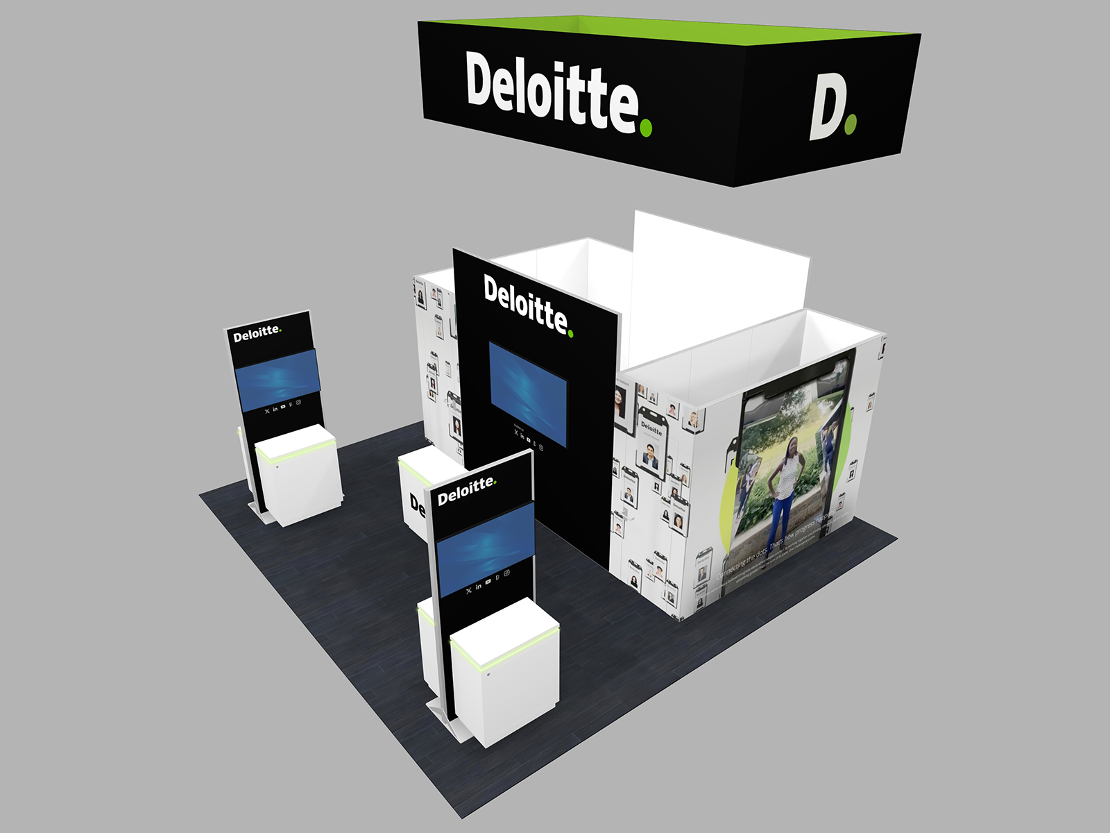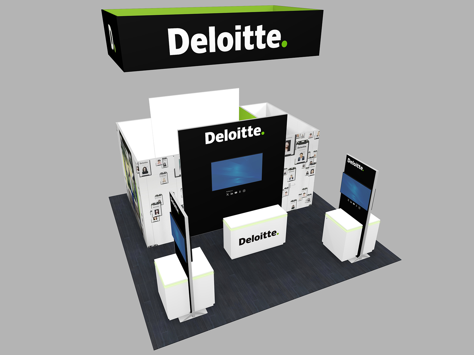 For many exhibitors, scheduled meetings are the main attraction of a trade show. They prearrange time with existing or potential clients and devote a portion of the booth to private meeting space. RE-9222 rental exhibit includes a prominent reception counter along with two double-side monitor kiosks.