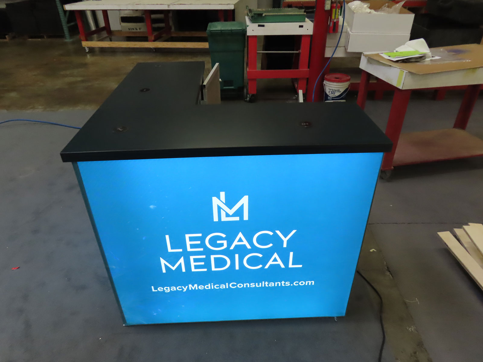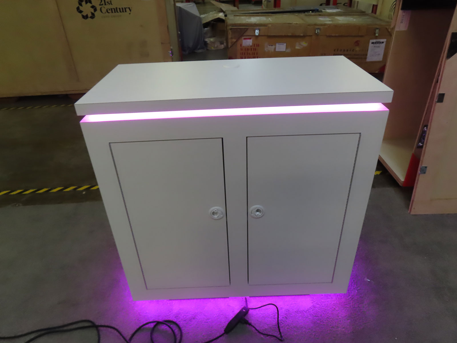 Counter with Vinyl Graphic, LED Accent Lights, and Locking Storage