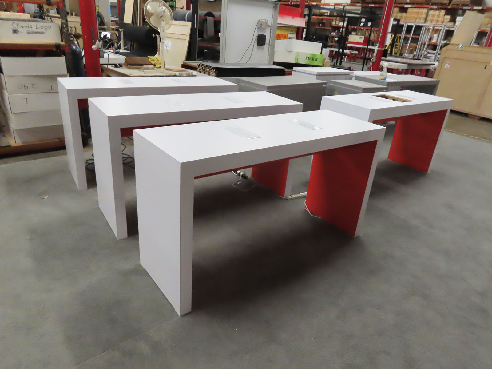 Station Table, (12) 48" Wide x 10" Deep White Laminated Shelves