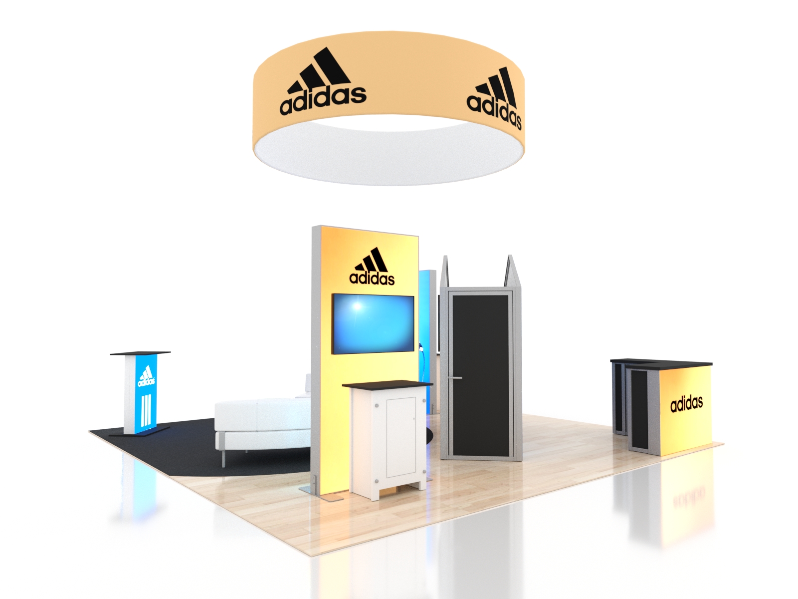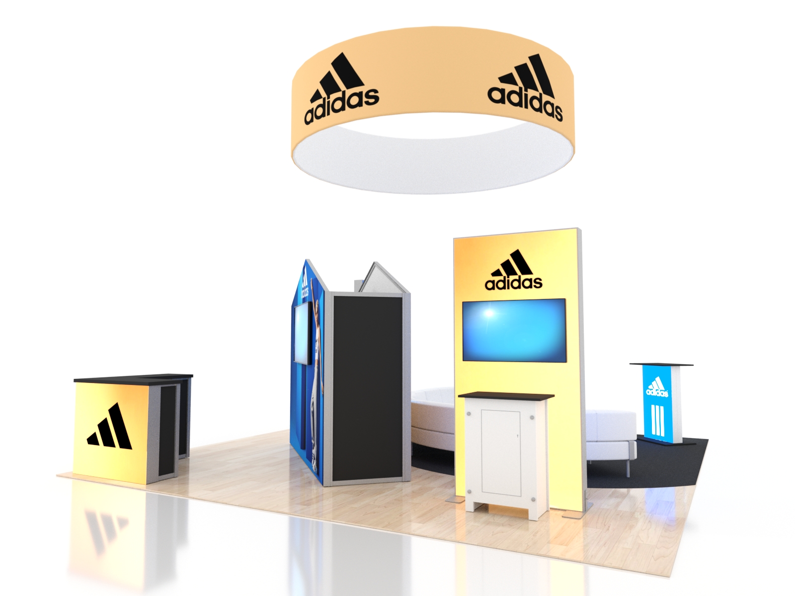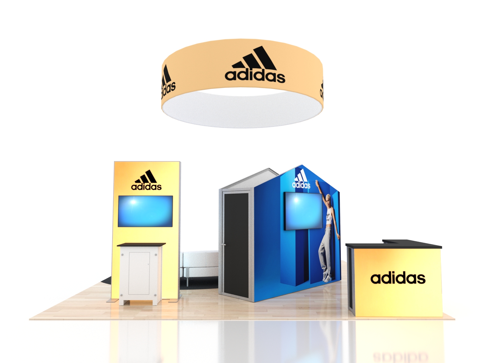 There’s even a large closet for…. well, just about anything, including personal items, giveaways, or demo products. It’s ideal for having everything you need close by without adding clutter to the booth space. For even more visibility, add a hanging sign so your brand can’t be missed by attendees anywhere in the show hall.