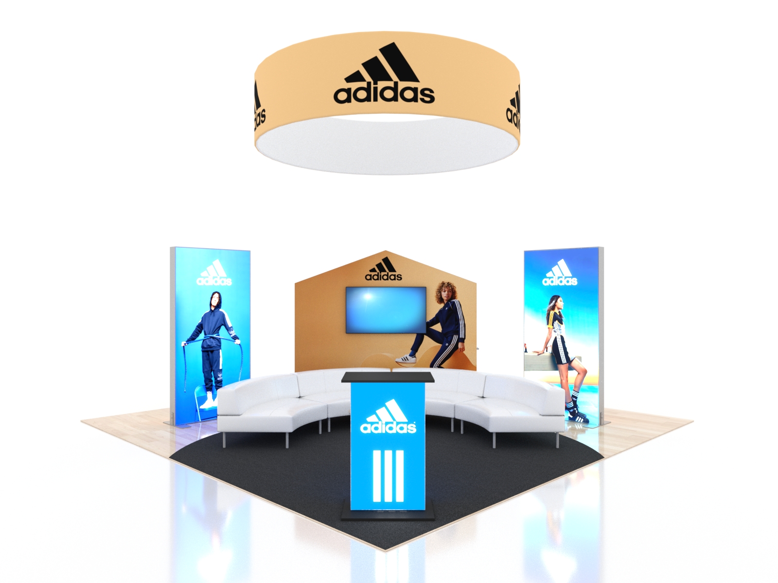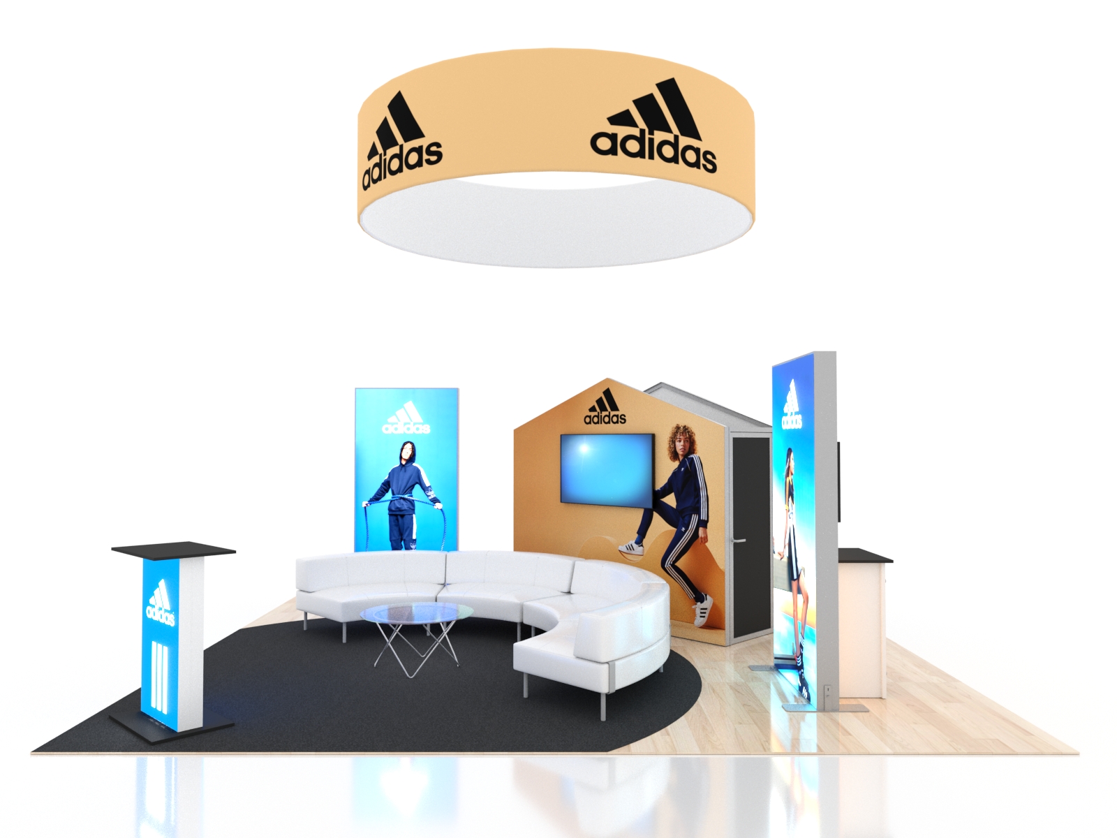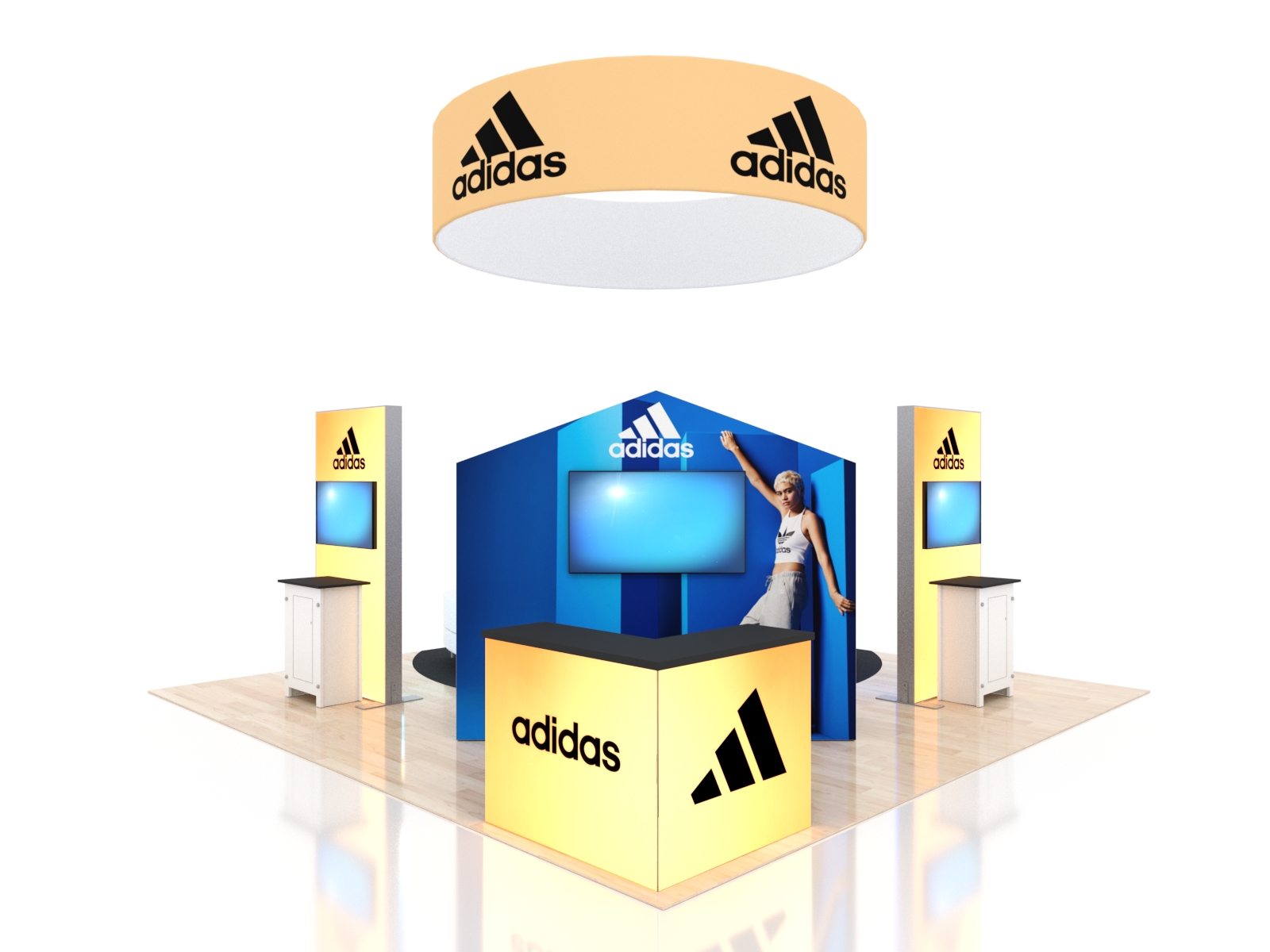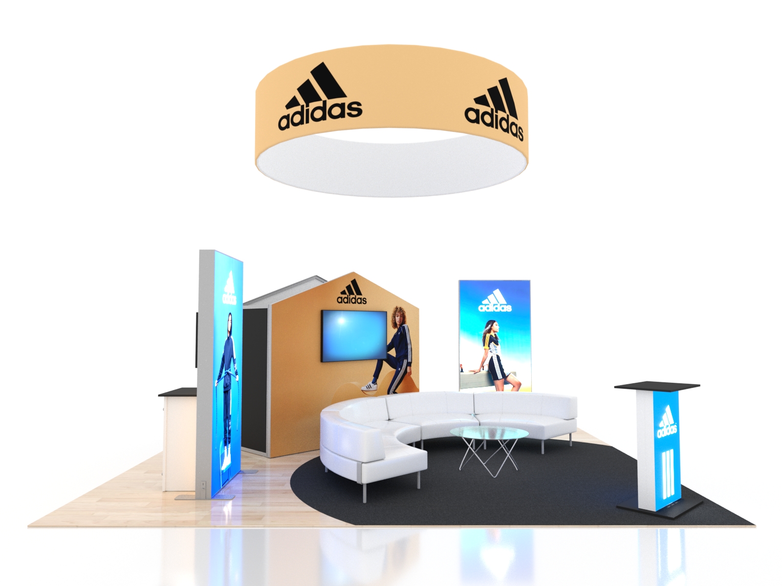 There’s even a large closet for…. well, just about anything, including personal items, giveaways, or demo products. It’s ideal for having everything you need close by without adding clutter to the booth space. For even more visibility, add a hanging sign so your brand can’t be missed by attendees anywhere in the show hall.
