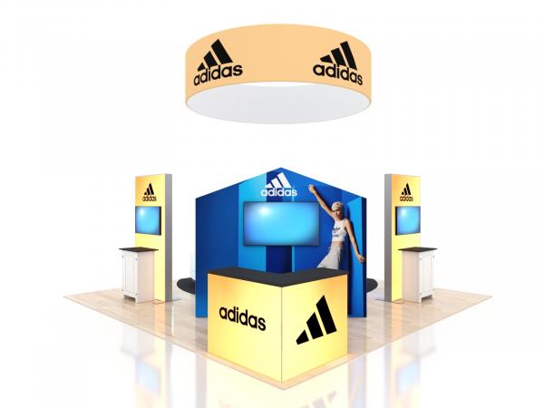 An island exhibit space offers exhibitors unlimited design options. Going small, instead of big, can be very effective depending on your trade show strategy. The VK-5212/5213 island series are inviting spaces with welcoming, comfortable seating for inept conversations with potential clients or catching up with current customers. The design features vivid backlit graphics in counters and towers, plus monitors, workstations and locking storage.